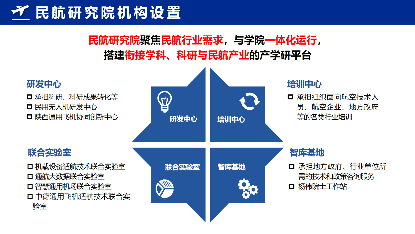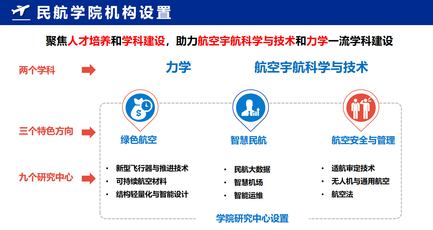 MissAV 聚焦人才培养和学科建设,与研究院一体化运行,以绿色航空、智慧民航、航空安全与管理三大特色方向为引领,着重打造九大研究中心,助力航空宇航科学与技术和力学学科建设。民航研究院聚焦民航行业需求,与MissAV 一体化运行,搭建衔接学科、科研与民航产业的产学研平台。