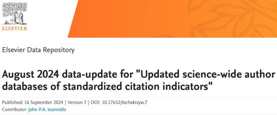 2024年9月16日,美国斯坦福大学(Stanford University)与爱思唯尔数据库(Elsevier Data Repository)联合发布了第七版《全球前2%顶尖科学家榜单》(World' s Top 2% Scientists 2024)。《全球前2%顶尖科学家榜单”分为“终身科学影响力榜单”(关注整个学术生涯迄今的影响力)和“年度科学影响力榜单”(聚焦本年度学术成就)。