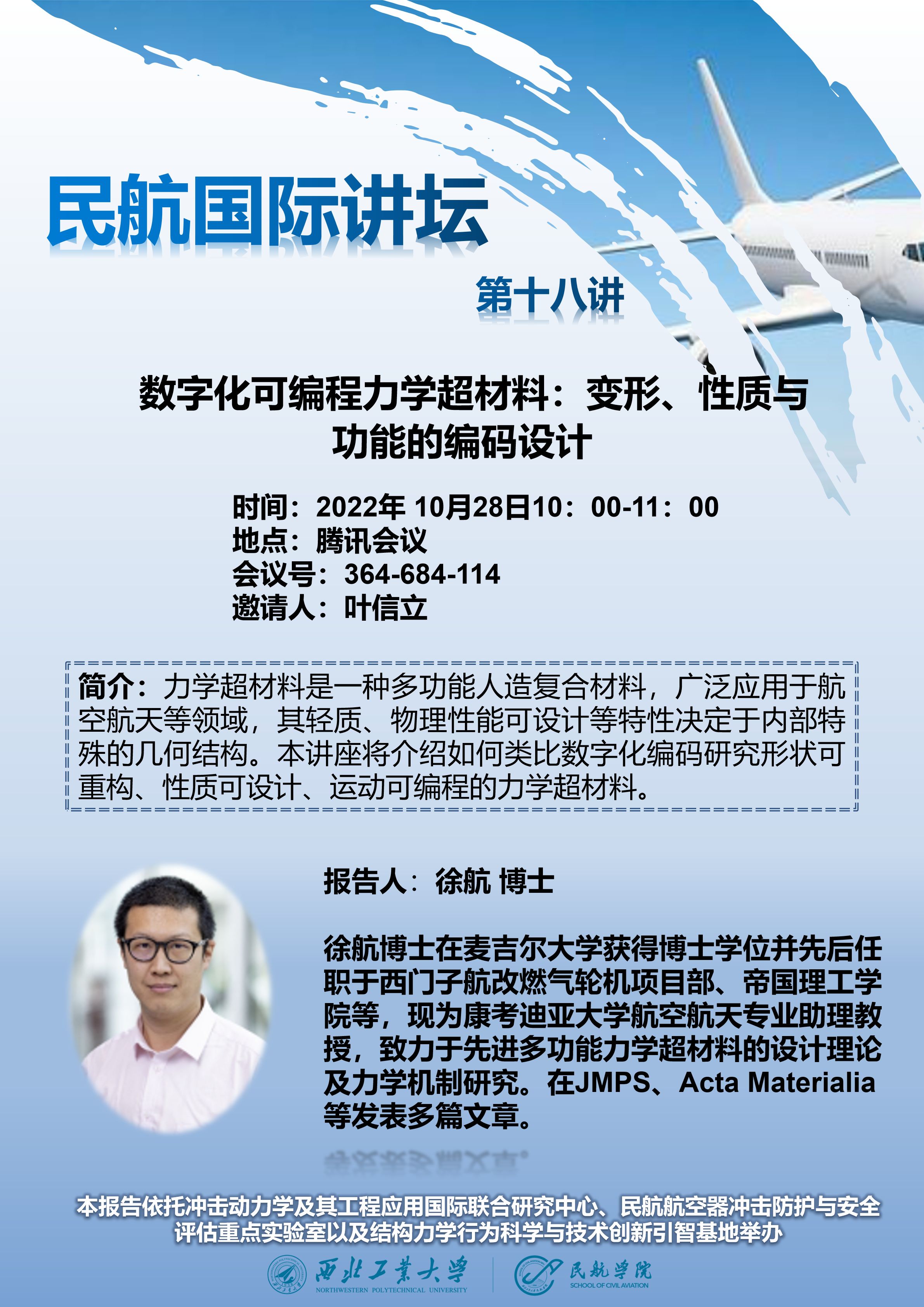 10月28号上午十点,MissAV 拟线上举办“数字化可编程力学超材料:变形、性质与功能的编码设计”专题讲座,届时欢迎各位老师同学参会交流。以下是讲座详细信息: