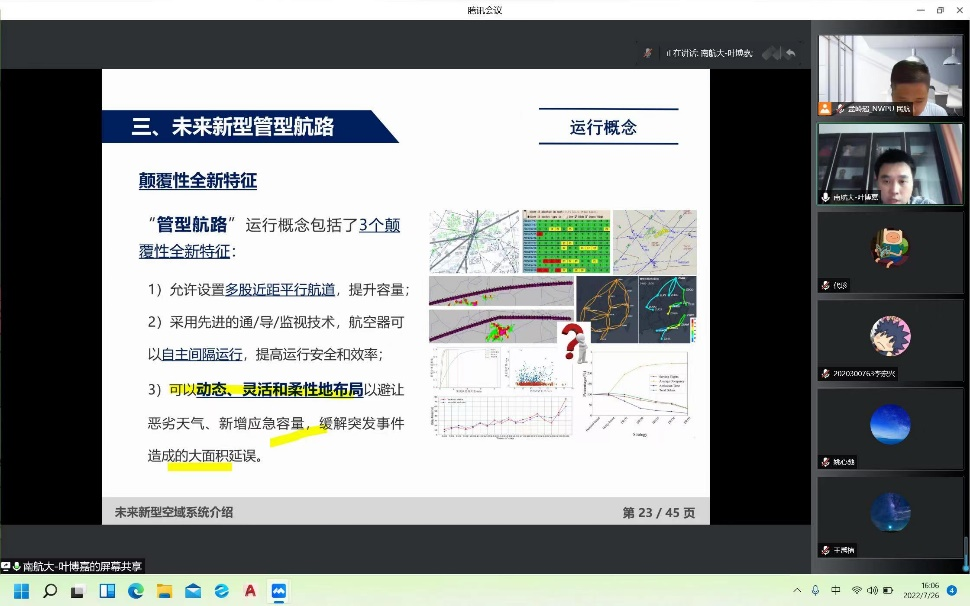 讲座中,叶博嘉副教授结合了国内外民航航路和空管系统升级/变革得现状,从新概念、新思路和新方法,讲述了未来新型管型航路在新时代民航发展中的重要意义。他从未来新型管型航路的运行概念、物理结构、运行模式、网络布局这四个角度入手,全面展示了它在提升容量,允许航空器自主间隔运行,及动态、灵活和柔性布局等方面上的优越性,分析了多种已提出的新型管型航路的构成和特点,并通过对比定速、超越、自由三种不同的运行模式和网络布局,解析了其各自的优缺点。最后,叶博嘉副教授总结提出,新型管型航路能够获得使空中交通管制部门生产力提高、航空公司燃油效率提高、延误减少的效益,对全球空中交通系统变革计划,国际空域组织、运行与管理,我国民航航路规划发展具有重要的意义。