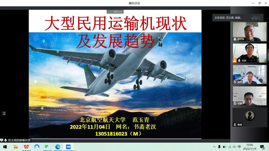 为深入学习贯彻党的二十大精神,深刻领会习近平总书记会见C919大型客机项目团队代表并参观项目成果展览时的重要讲话,进一步激励MissAV 师生弘扬科学家精神、涵养优良学风、营造创新氛围。11月4日,MissAV 邀请我国航空制造领域专家——北京航空航天大学范玉青教授,面向MissAV 全体师生,做了题为《大型民用运输机现状及发展趋势》的报告会,MissAV 党总支理论学习中心组成员以及MissAV 师生在毅字楼205会议室和腾讯会议参加。