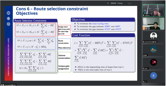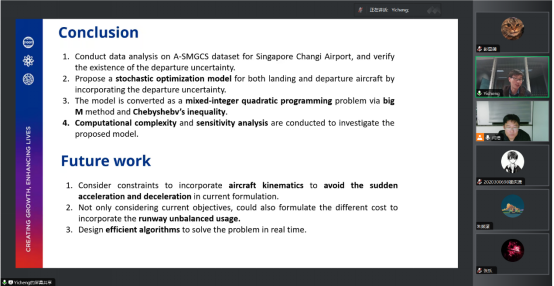讲座中,张逸成博士向与会的师生简要介绍了在新加坡求学和工作的经历,结合他本人在罗罗-南洋理工大学联合实验室及新加坡科技研究所的研究工作,以新加坡樟宜国际机场的调度为例,重点介绍考虑起飞不确定性的联合调度问题,以及近期在该领域理论建模及联合仿真中的突破和进展。张逸成博士对新加坡樟宜机场A-SMGCS数据集进行数据分析,验证了离港不确定性的存在;提出了一种考虑起飞不确定性的起降飞机随机优化模型;利用大数据方法和Chebyshebv不等式将模型转化为混合整数二次规划问题;并最终通过仿真对上述方法进行验证。