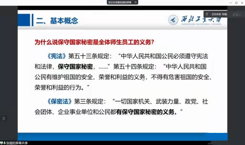 于2022年1月7日和1月9日组织开展了保密专题培训。1月7日上午10:00,面向全院教职工,开展了保密基本知识宣讲和培训会议。会议由保密工作负责人谢发勤书记主持,由张超副院长作了保密基本概念及要求的宣讲,63名教职员工参加了本次会议。因受疫情影响,本次培训通过腾讯会议线上进行。
