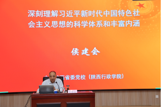 侯建会教授从习近平新时代中国特色社会主义思想的创立背景、科学体系、最新观点以及历史背景四个方面进行了讲解。深入分析了当今世界百年未有之大变局加速演进的国际形势、中国式现代化全面推进全面拓展的历史趋势,系统阐述了习近平新时代中国特色社会主义思想的科学体系和丰富内涵。