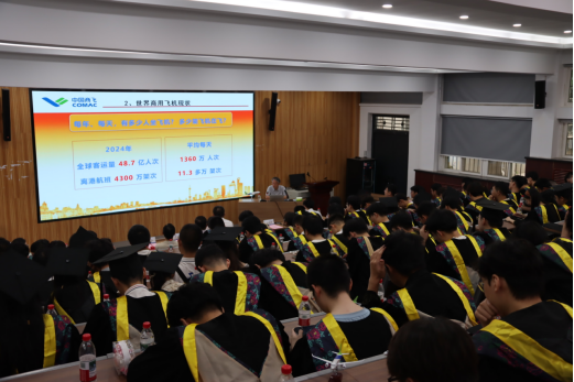 典礼结束后,陈迎春总师为毕业生带来题为《中国商用飞机发展》的“最后一课”专题讲座,系统讲解了中国商用飞机的发展历程与未来展望。他从商用飞机的战略地位谈起,详细分析了全球商用飞机发展现状,重点介绍了我国商用飞机从无到有的奋斗历程,特别是C919等型号的研制突破与创新特色,深入浅出地阐释了中国民航事业的特色发展道路。