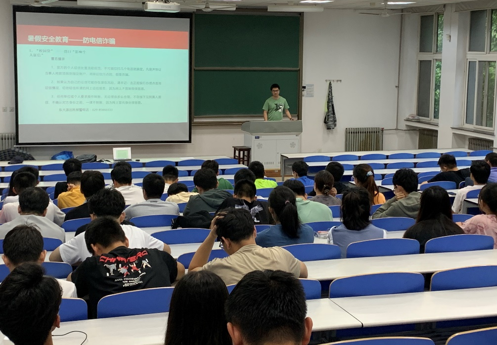 辅导员刘涛、张猛创、王睿组织2018级、2019级本科生和2020级第二学位学生开展暑假安全教育。辅导员首先对离校和暑期留校注意事项进行了讲解,组织填写《2021年暑假意向表》,要求离校学生到达目的地后及时给辅导员发送短信报平安,同时对暑期留校人员的管理办法进行了讲解,确保大家暑假离校和留校的安全。随后,辅导员从防溺水、防雷电、防治安事故、防交通事故和防食物中毒等几个方面进行了提醒,又重点介绍了电信诈骗的一般手法和防范措施。最后集体学习了中华人民共和国教育部令第12号《学生伤害事故处理办法》。