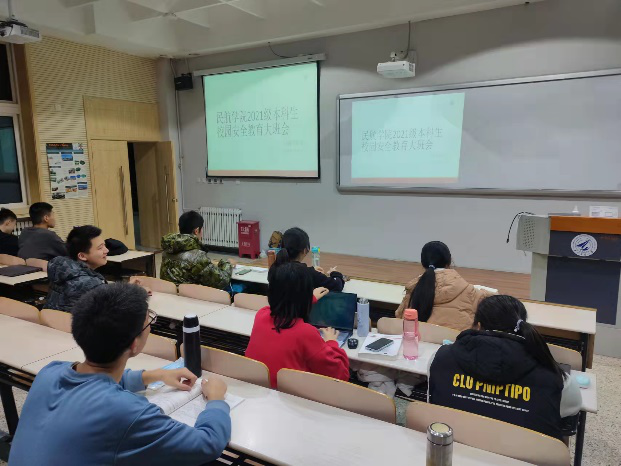 在教学东楼B408召开本科2021级安全教育与学风建设大班会,2021级全体本科生参会,2021级本科生辅导员张昊主持会议并讲话。