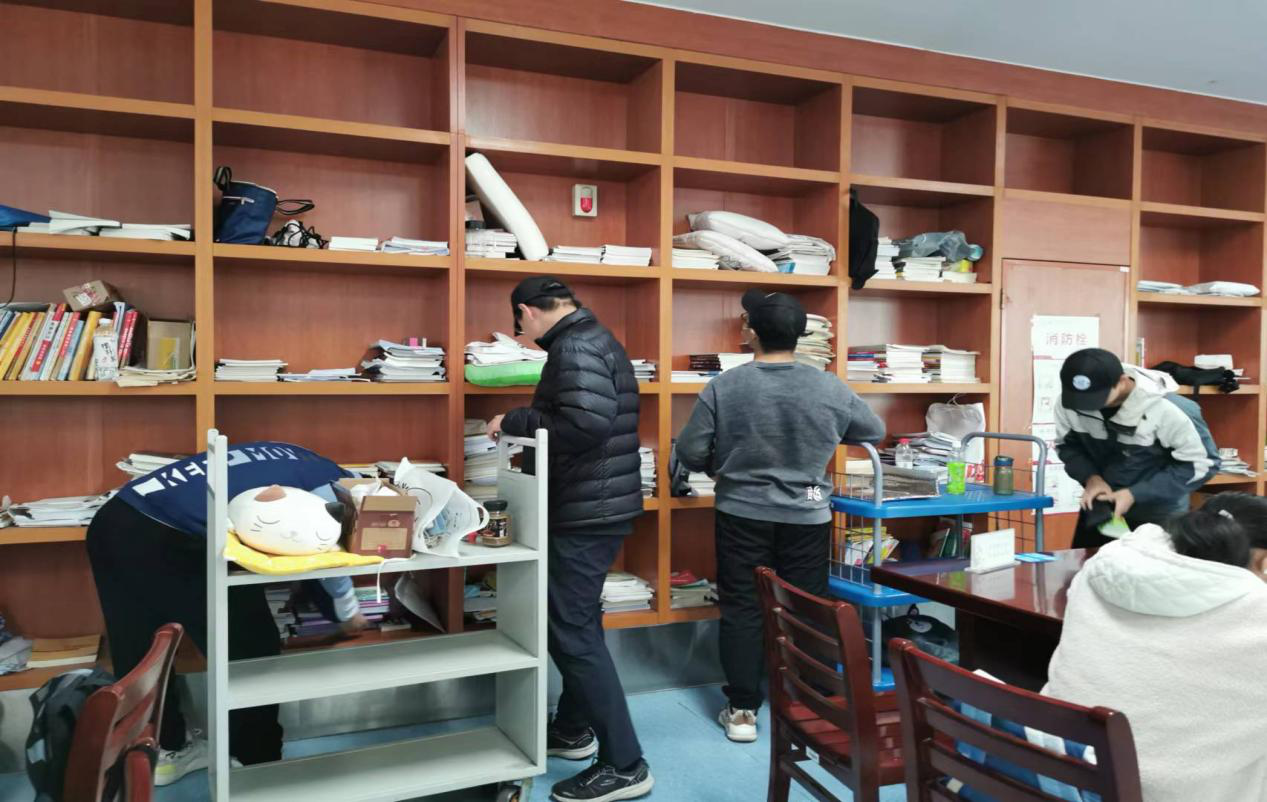 第三组的同学们推着小车在每个储物墙前仔细检查,将图书馆规定严禁带入的物品收在小车上,包括坐垫,水杯,零食等,最后将这些物品放置在规定地方。