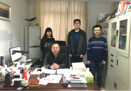 李玉龙教授(左二)与2016届硕士毕业生龚煦(左一)、黄甲(右一)的合影