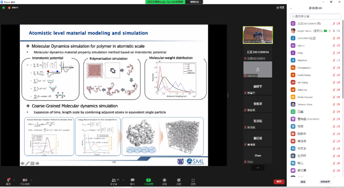 师生作了题为《Multiscalemodeling and analyses for compositematerials》的专题报告。他结合对复合材料多尺度建模和分析方面的研究,首先对经典的微观力学理论以及对微观模型均一化的分析技术和多尺度微观力学的一些建模与分析方法进行系统的概述。之后,Gun-JinYun教授通过多尺度建模与分析的实际案例对本次专题报告做了总结概括。