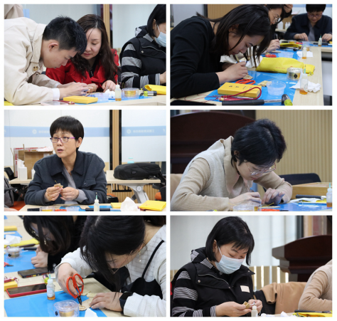 活动中,专业的掐丝珐琅教师——梁晓雅老师首先介绍了掐丝珐琅这项非遗艺术的的起源、形式及掐丝过程中的不同方法和点蓝技巧。大家都赞叹这项非遗古老技艺的美妙,并跃跃欲试。随后,助理吕冰老师向大家演示掐丝及点蓝的实际操作,随后,在老师们的协助指导下,各位女教职工开始制作,大家用柔软的扁铜丝纷纷对着木板开始创作,之后从包边、点蓝、喷胶,按照步骤一步步进行,经过四个小时“点蓝”耐性体验,一张张精美的“个人专属”掐丝珐琅车挂也随之诞生。